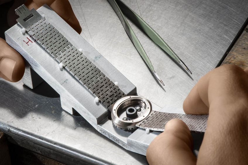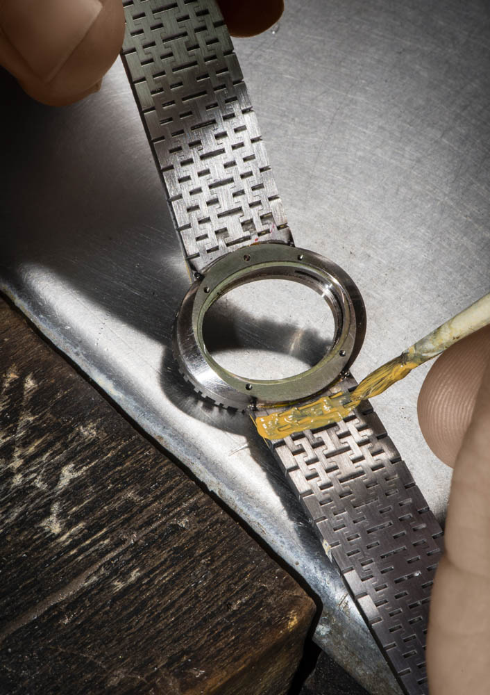 Ajustement du bracelet avec le boîtier. Le tout est ensuite pointé au laser par le dessous pour être maintenu