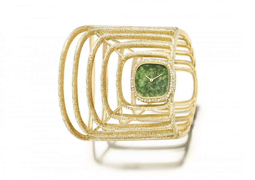 A manchette watch from the Extremely Piaget collection features gold hammering and a natural jade dial