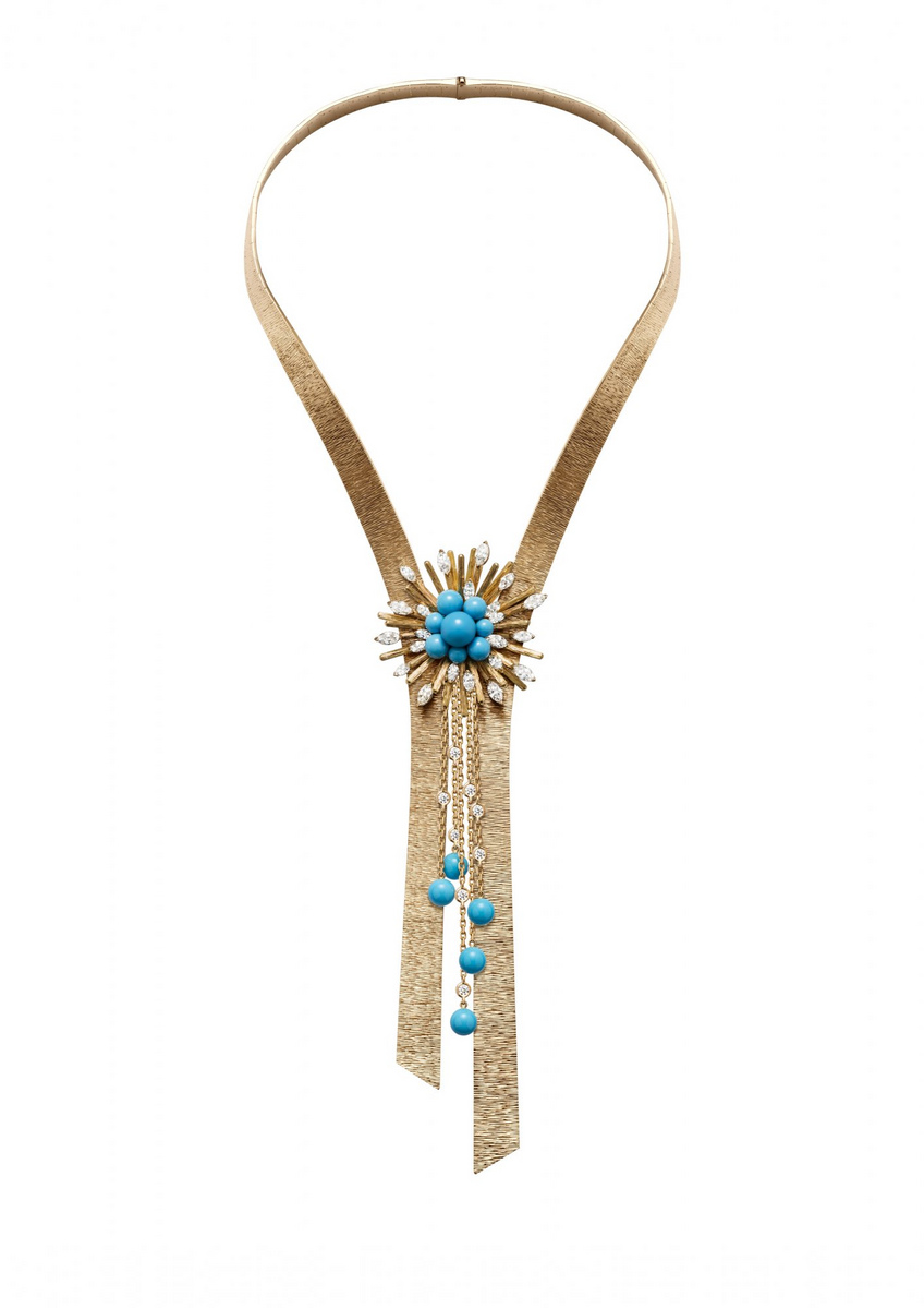 With golden thread and colourful stones, this luxuriant necklace embodies the glamour of the gold age. As in the case of bracelets with a ‘palace’ décor, the outside part of the bracelet look like an iridescent ribbon which some compare to wild silk. The inside of the bracelet on the other hand reveals hundreds of links interwoven with each other with a degree of precision that give this “fabric” such a supple feel. Emblematic of Piaget’s work, this mesh is not merely used for the bracelets on certain watches, but also for rose gold necklaces and bracelets with turquoise beads and marquise-cut diamonds.